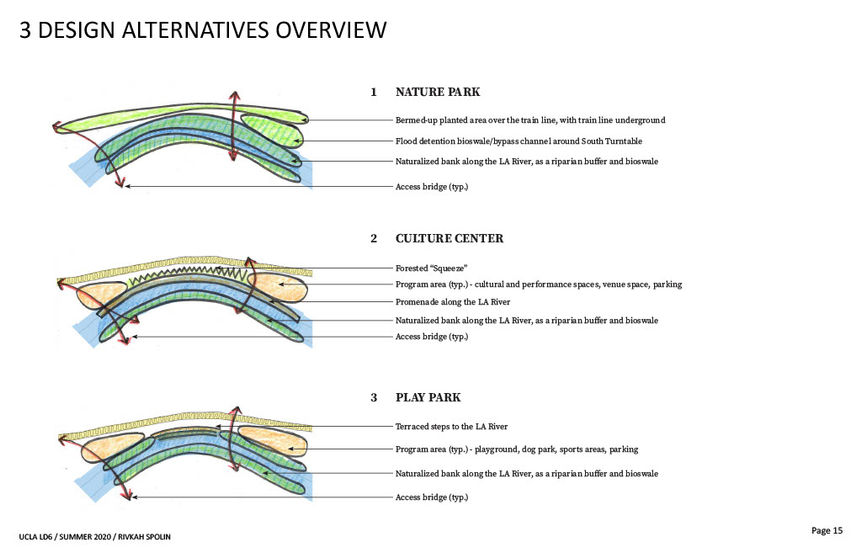 the LA River. “Play” is also a major component of the Park: a children’s playground, basketball courts, a daylighted stream, beach, kayak docks, a lower bike path, a sculpture garden, and lighthouse-like climbable High Tension Power Lines are features of the design proposal.